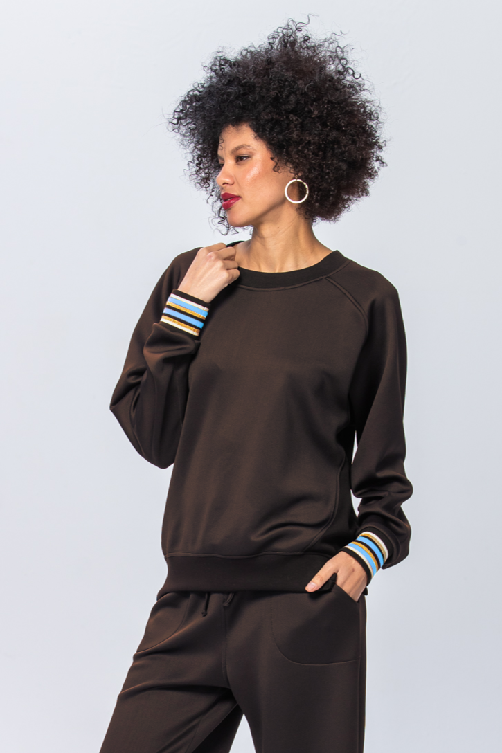 Crafted from 260g super soft luxurious brushed fleece, the warm chocolate creates instant versatility while contrast cuffs add sophisticated detail. The wide hem at the bottom and split cuffs ensure easy wear and effortless movement, making this piece as functional as it is stylish.