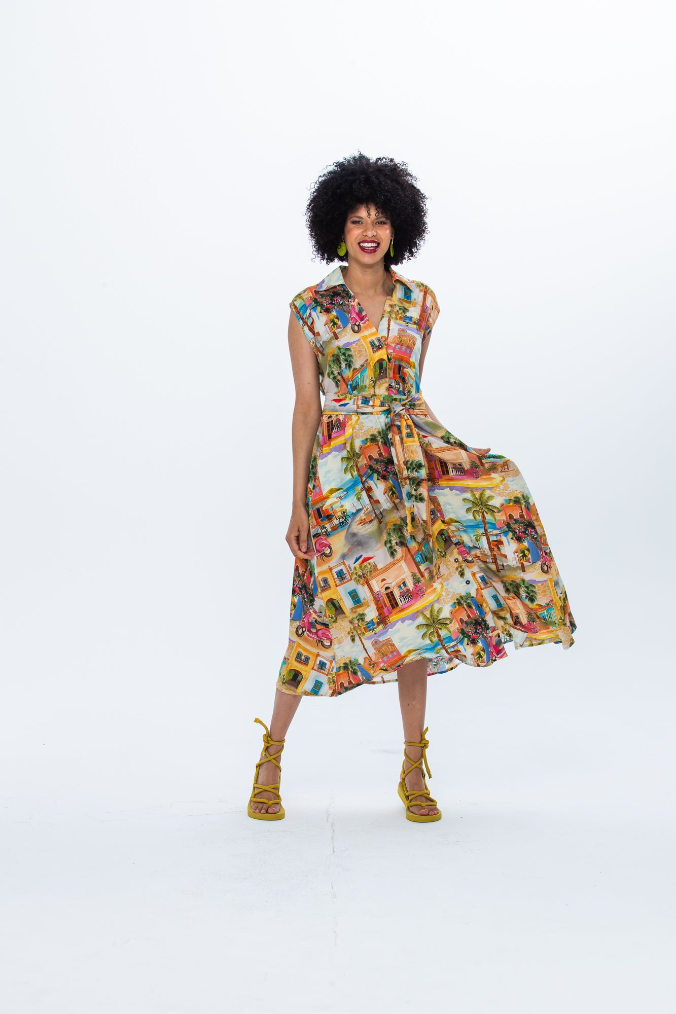 The Cabo gives this print structure. Belted at the waist, the A-line skirt lets the scene fall and move in a way that changes with every step. If you loved the Pink Vespa on the Sorrento Skirt, this is the dress version - same energy, different silhouette.