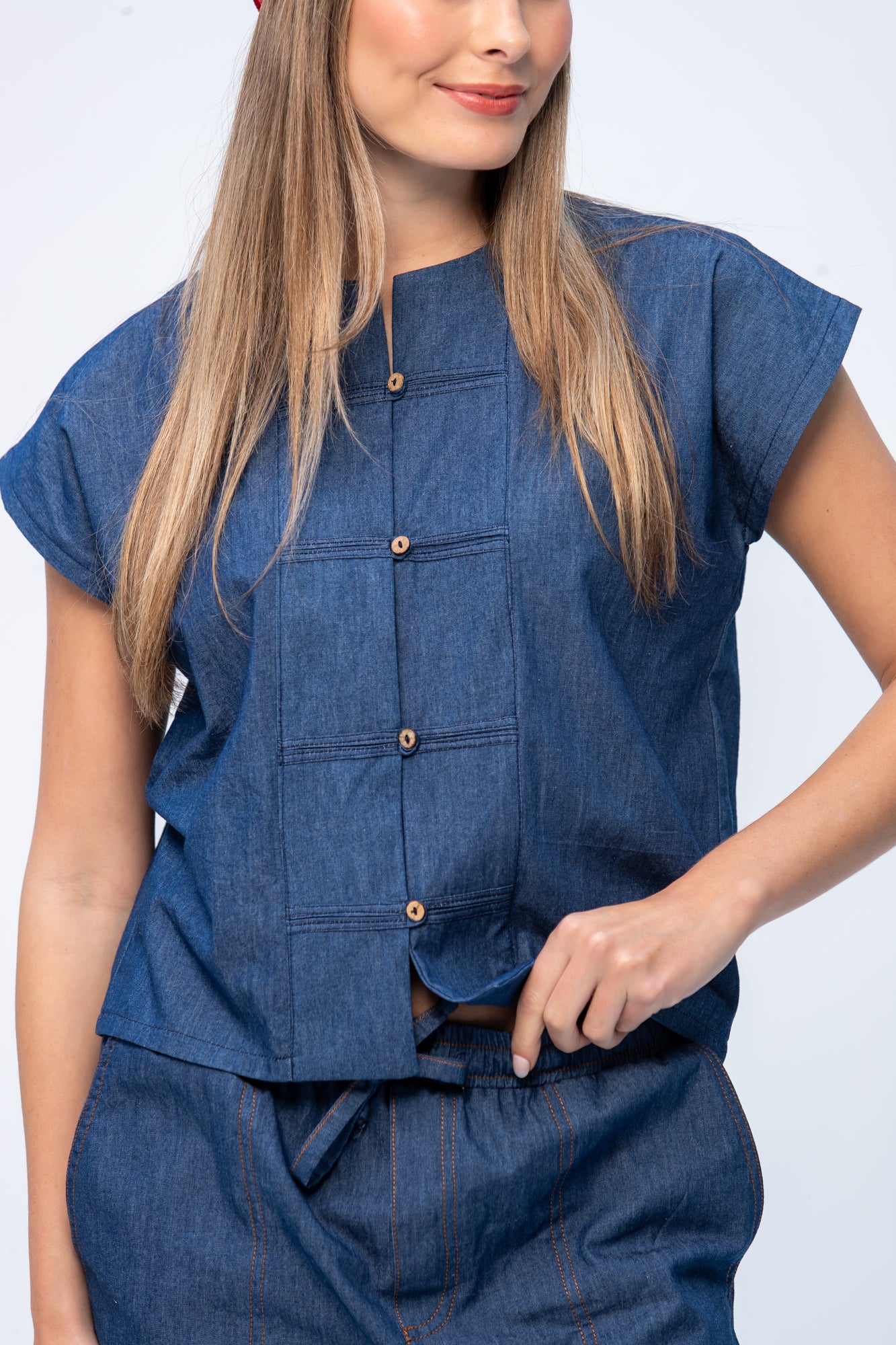 Precision meets rebellion in our new COCO button-front shirt. Crafted from 100% cotton denim, this structured piece redefines classic tailoring with a modern edge. The clean round neck collar and distinctive button closure create sharp lines that command attention without demanding it.