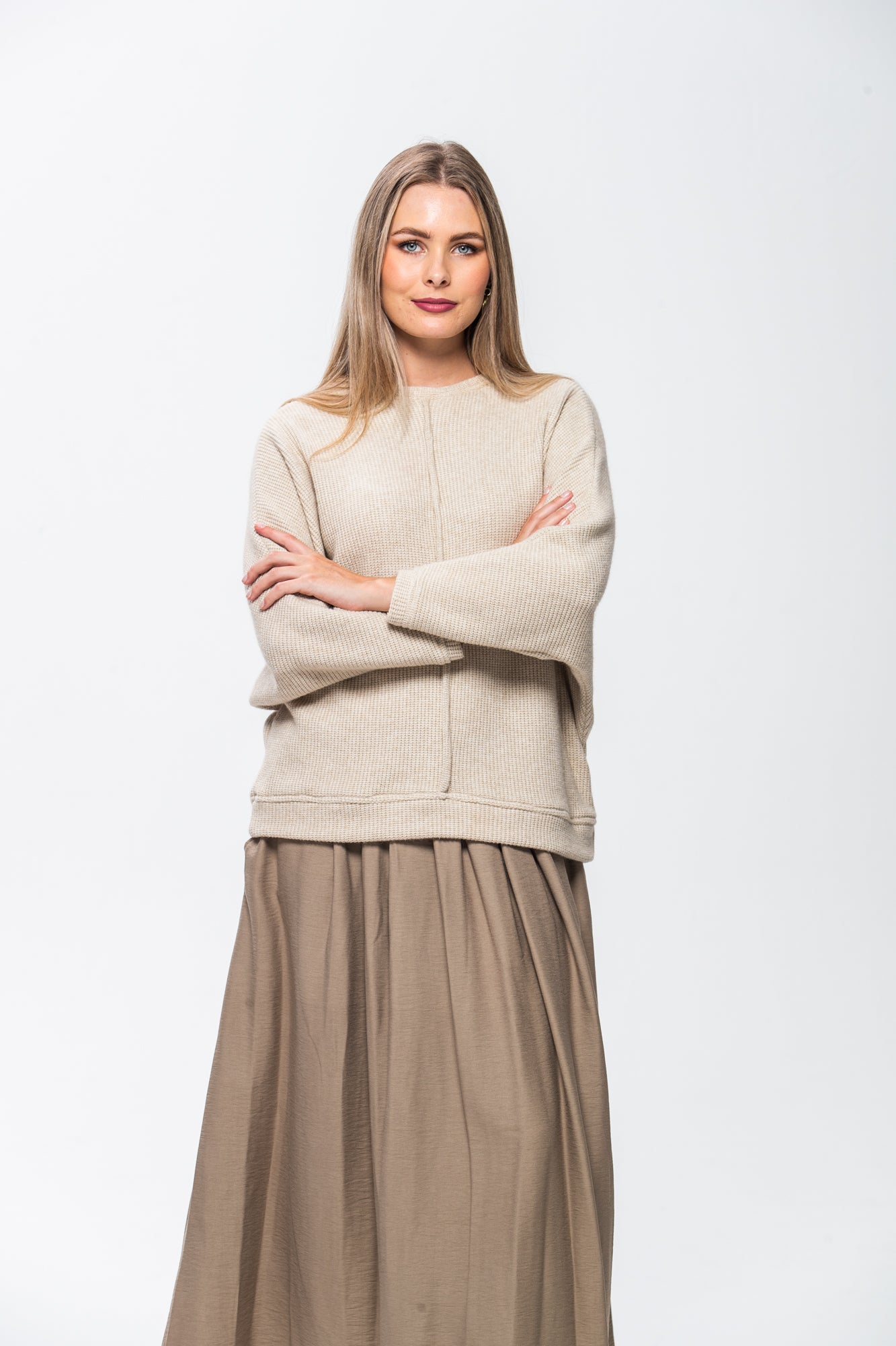 Crafted from a heavyweight luxurious knit in a rich creme tone, the oversized silhouette creates a relaxed yet refined presence. Distinctive dolman sleeves offer dramatic volume, while the ribbed waistband and cuffs provide subtle structure. The front and back center seam detail adds an unexpected element of precision to the jersey.