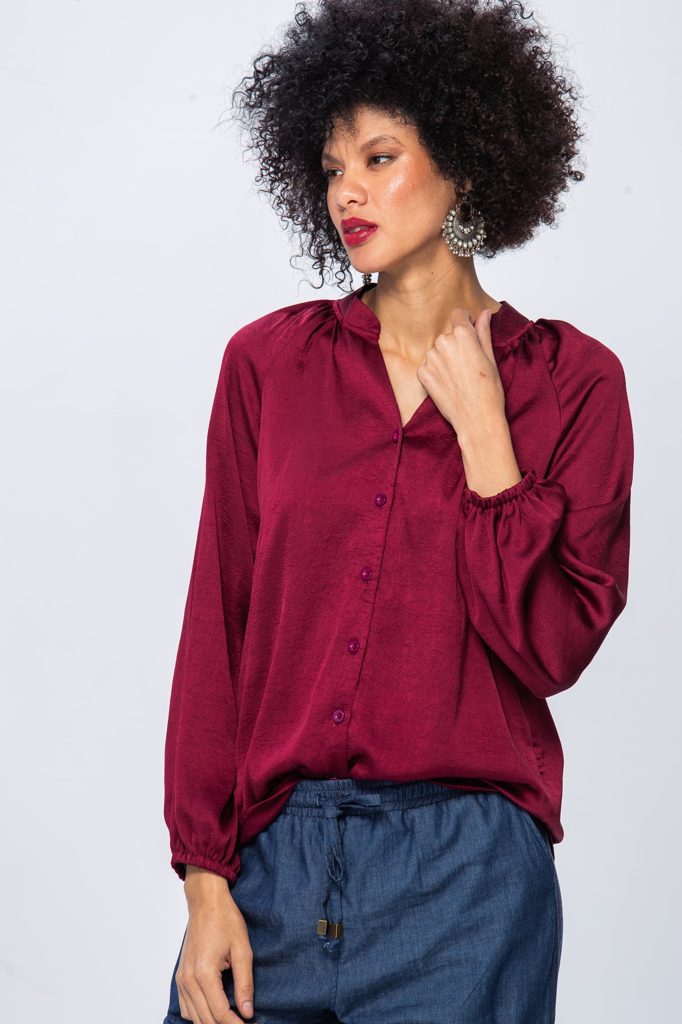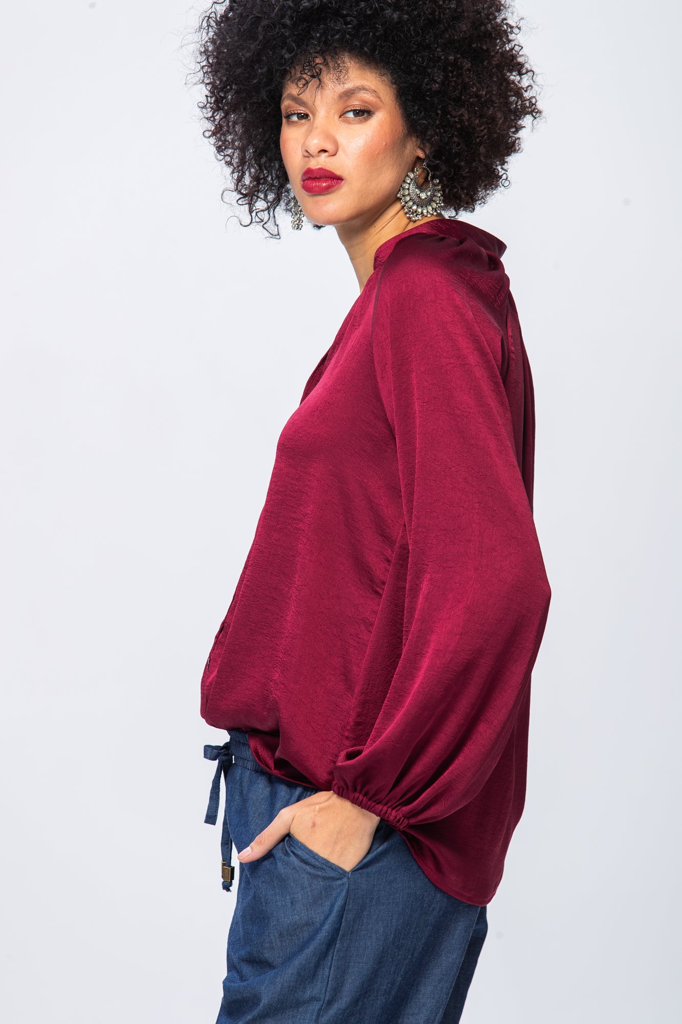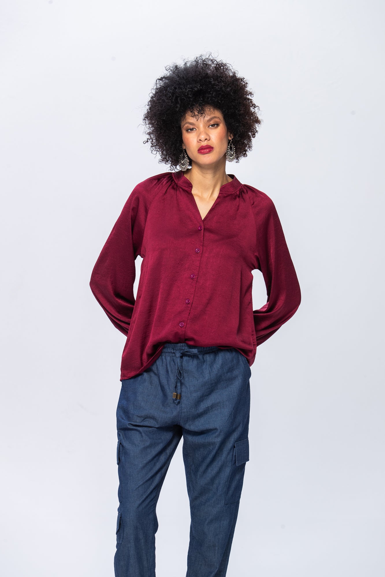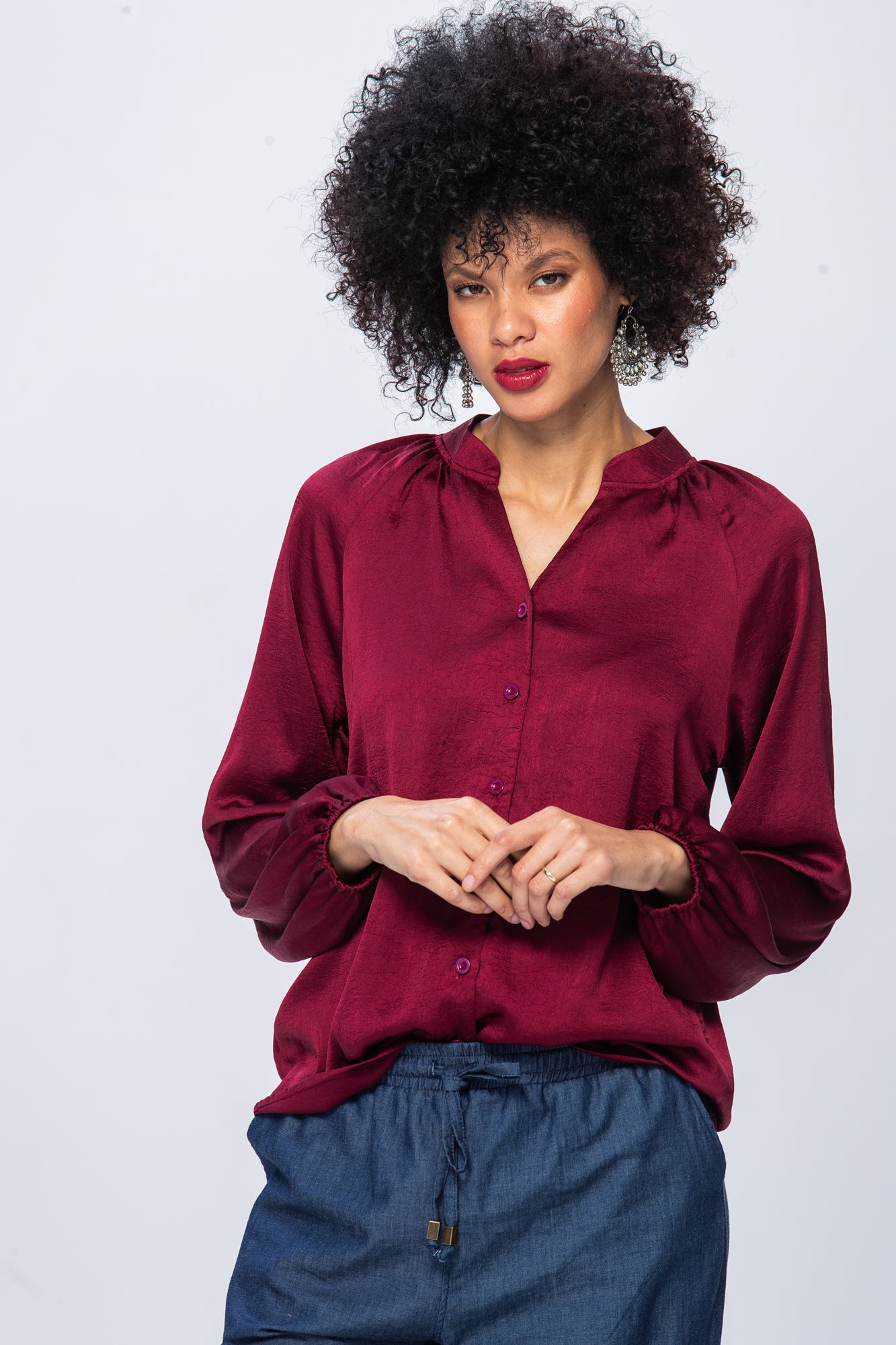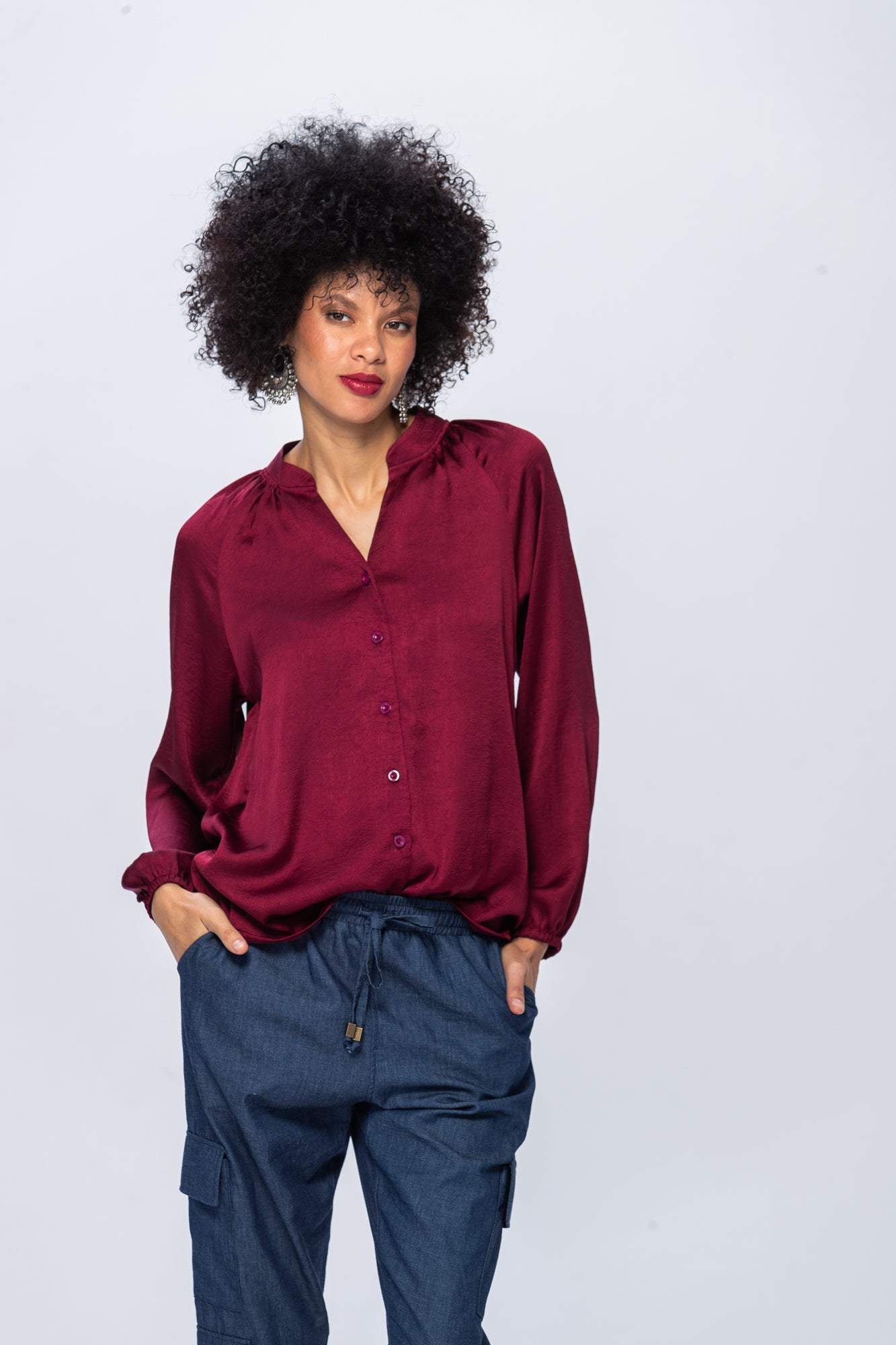 Made from luxurious crushed satin in a gorgeous rich ruby red, this relaxed silhouette features a full button stand with raglan-style sleeves that move effortlessly with you.