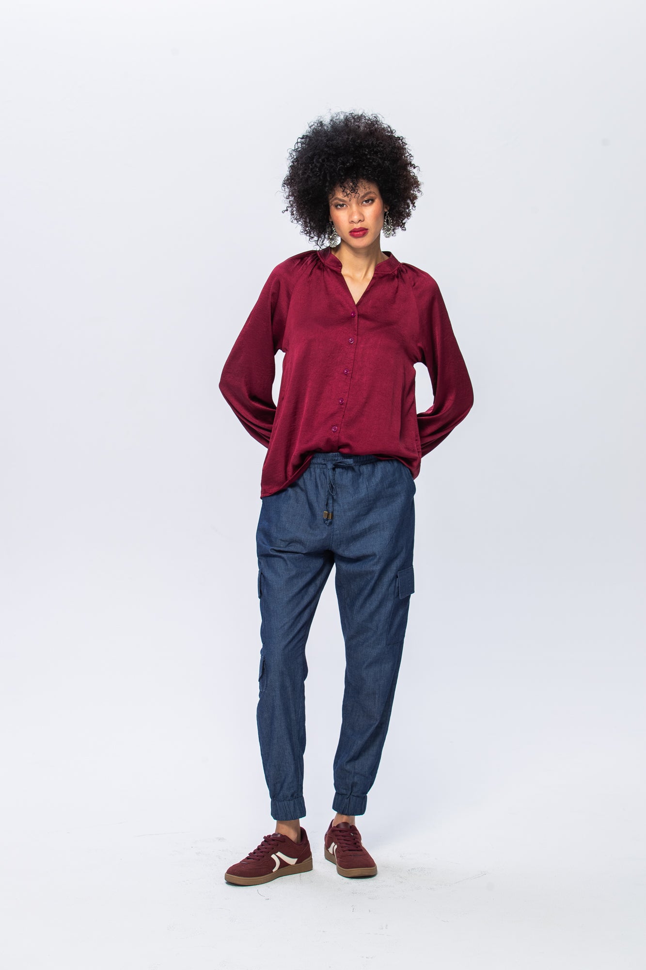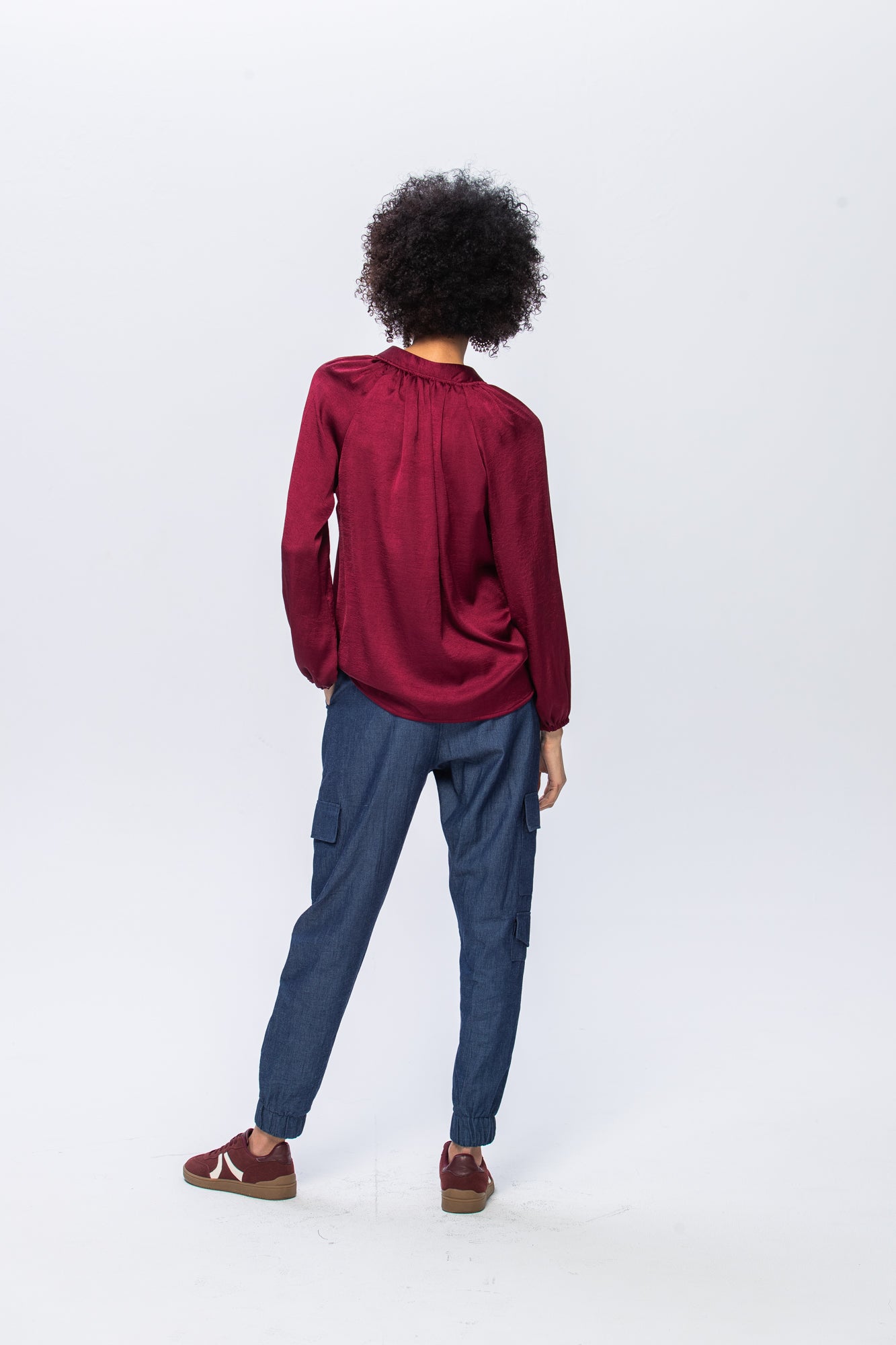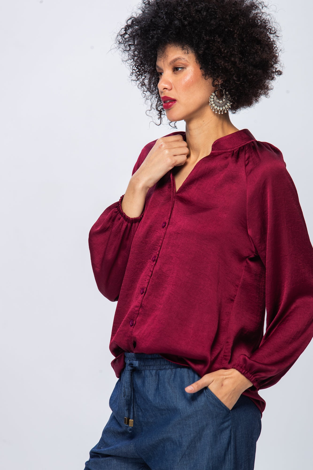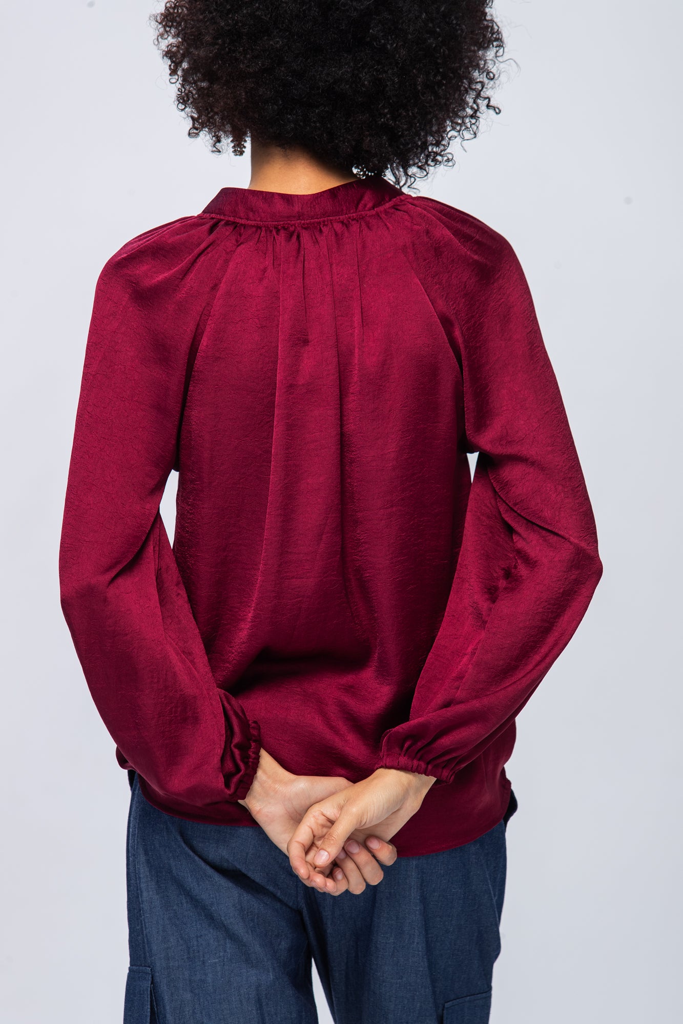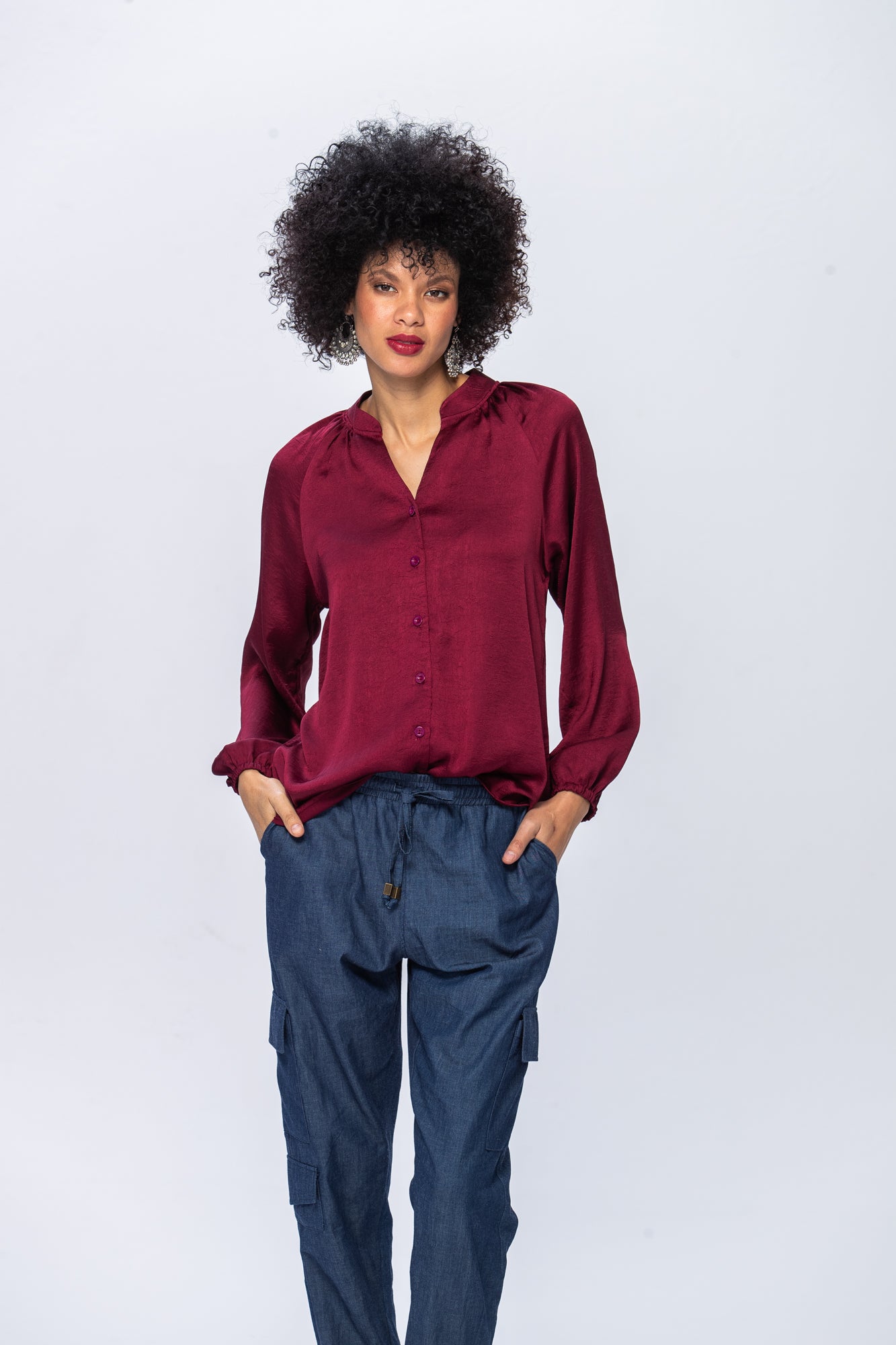Made from luxurious crushed satin in a gorgeous rich ruby red, this relaxed silhouette features a full button stand with raglan-style sleeves that move effortlessly with you.
