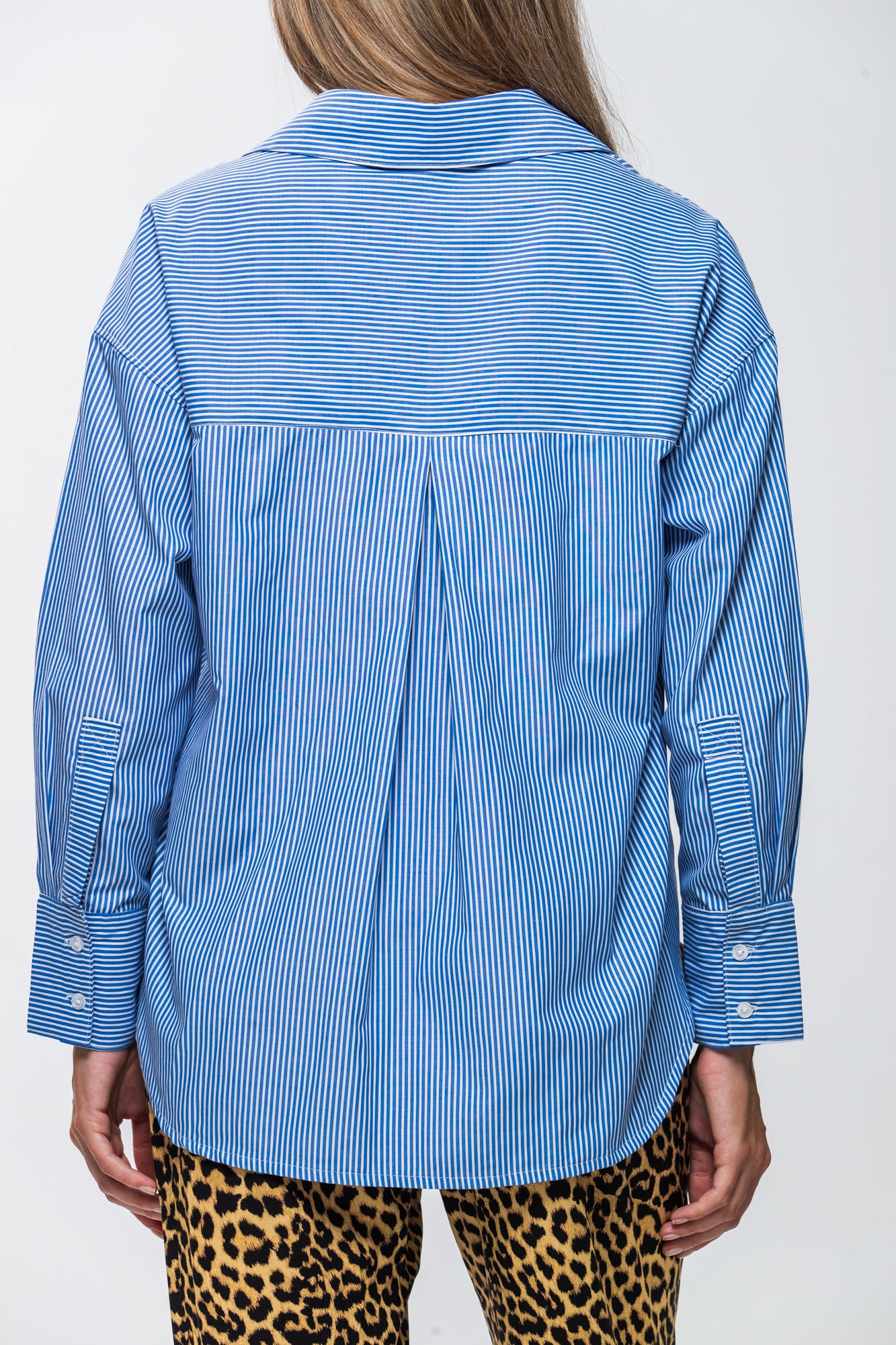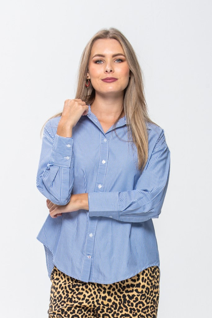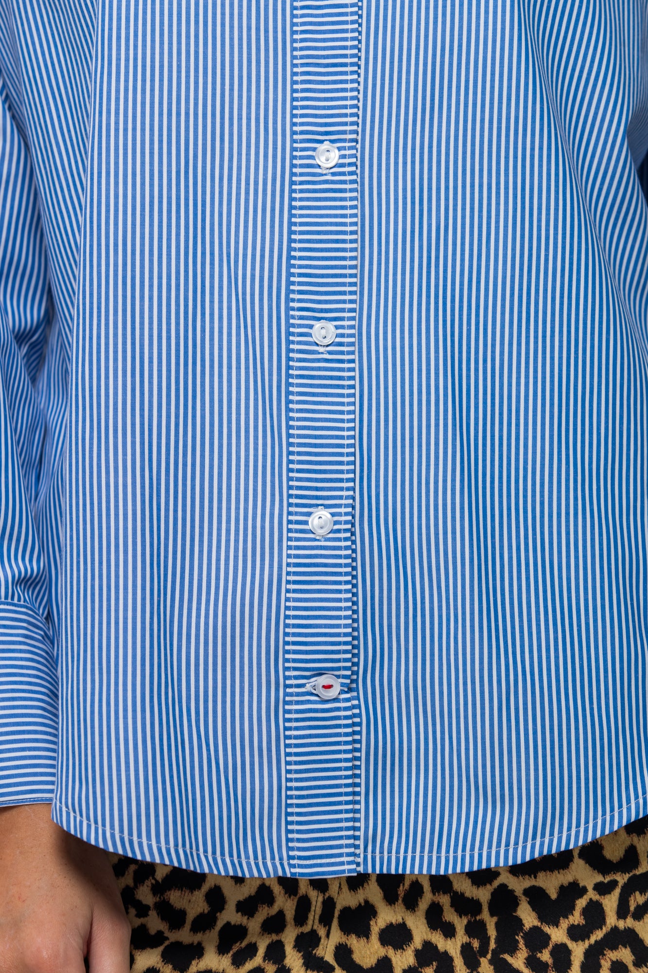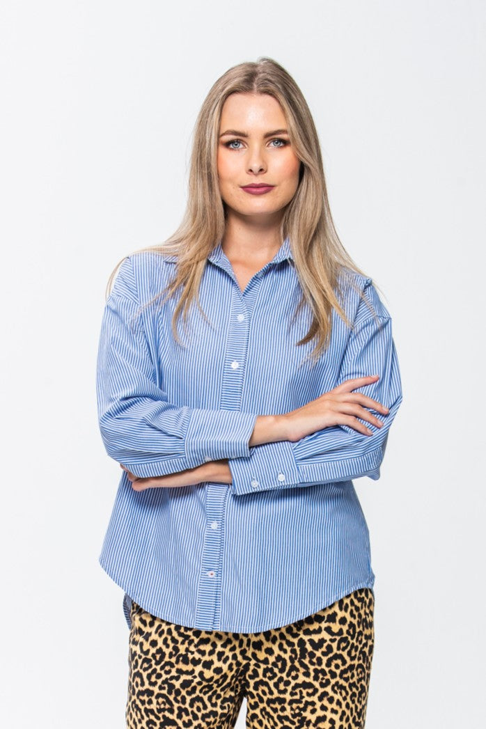 Made from a beautiful cotton blend fabric in ac classic but on trend blue and white stripe, the oversized silhouette creates an effortless drape with deliberate presence. Clean lines and a structured collar construction honour tailored precision, while thoughtful details like unexpected pops of red thread at the collar and final button add subtle dimension to the design.