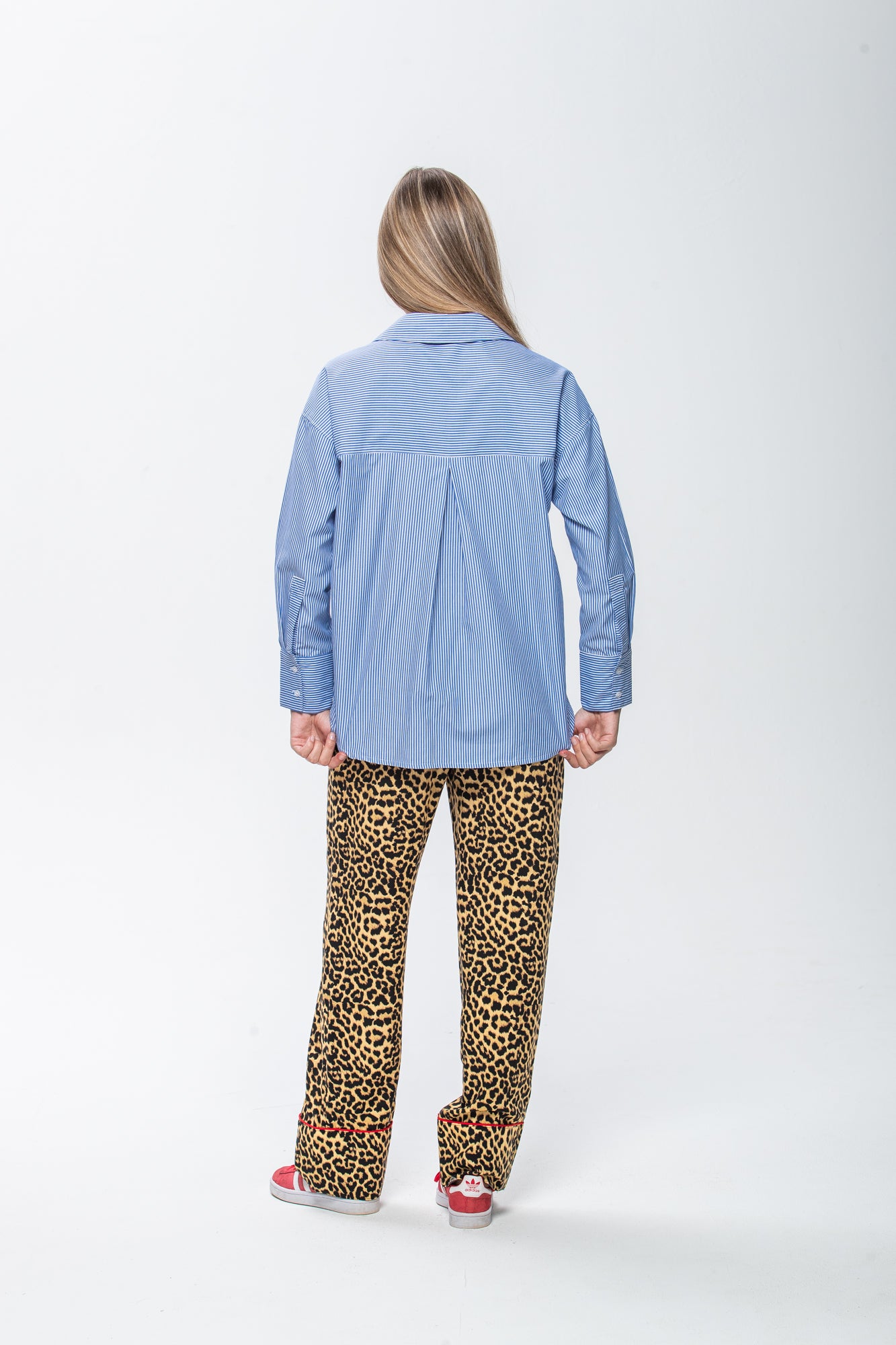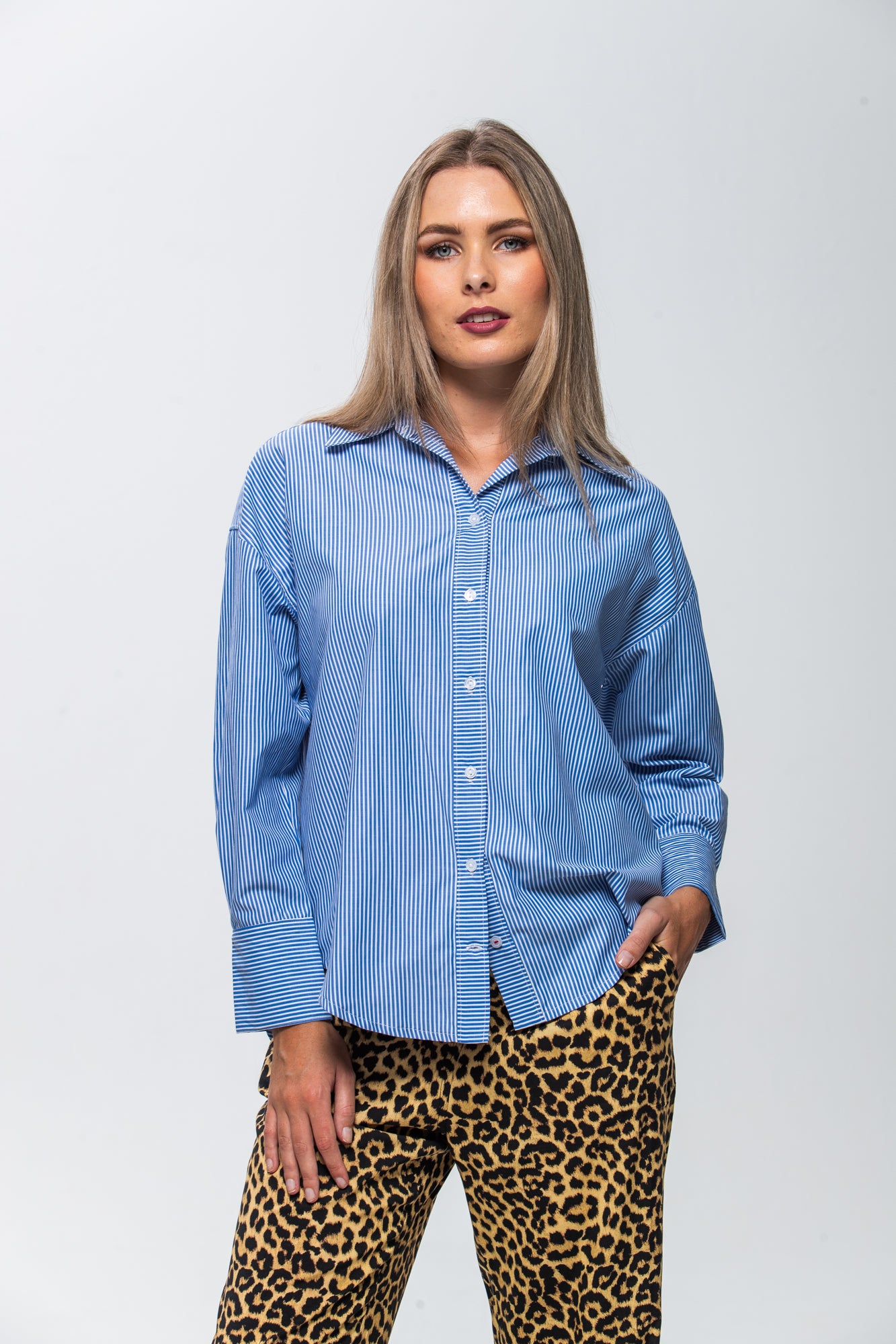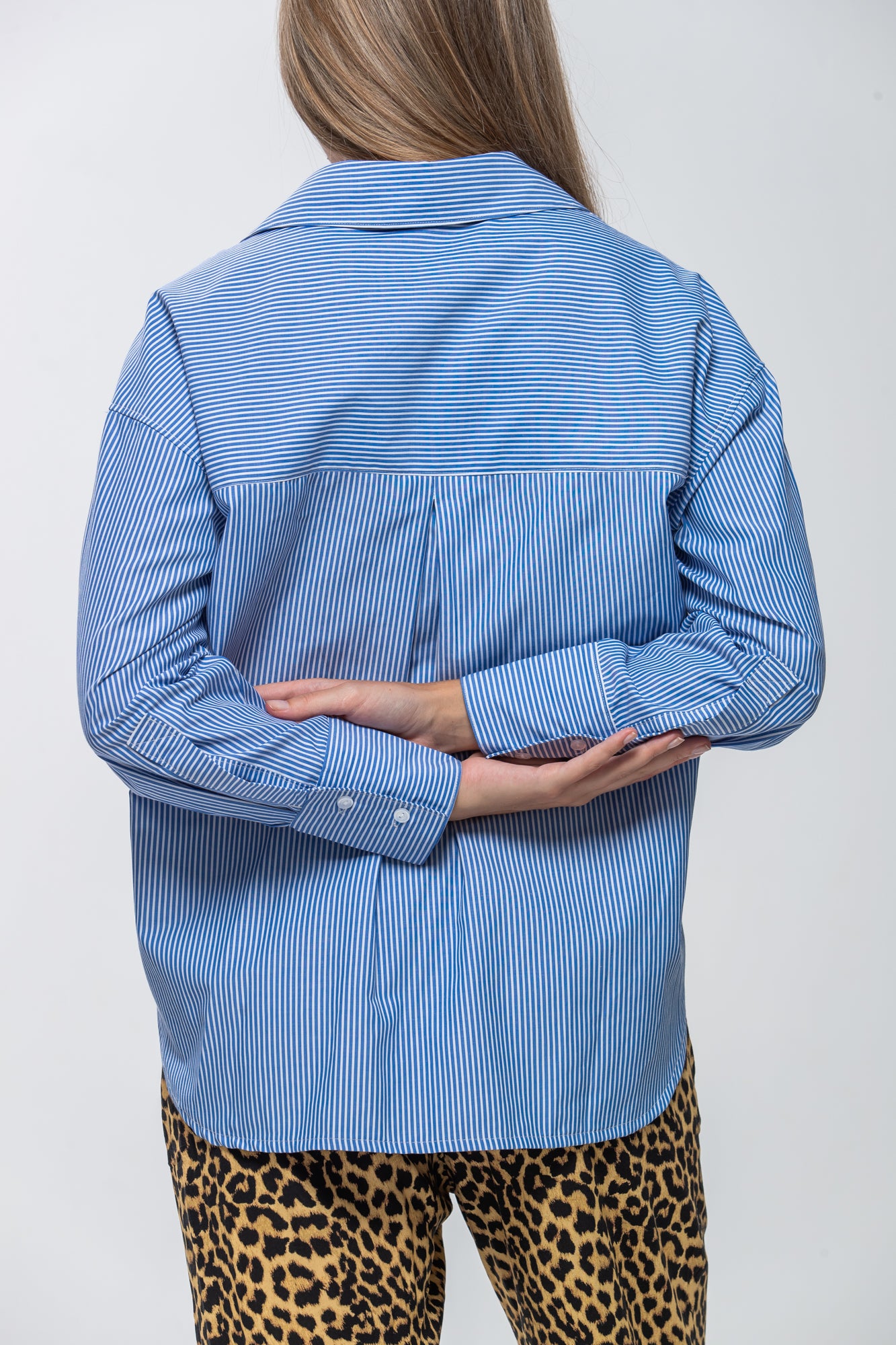 Made from a beautiful cotton blend fabric in ac classic but on trend blue and white stripe, the oversized silhouette creates an effortless drape with deliberate presence. Clean lines and a structured collar construction honour tailored precision, while thoughtful details like unexpected pops of red thread at the collar and final button add subtle dimension to the design.