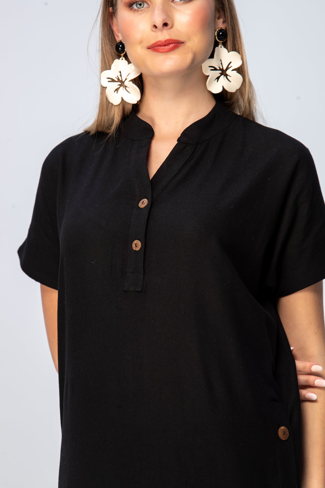 This linen kaftan features high slits with buttons at the sides so you can reveal or conceal as you like. The mandarin collar, button placket, and dropped shoulders create the perfect relaxed fit, while essential pockets add practical sophistication.