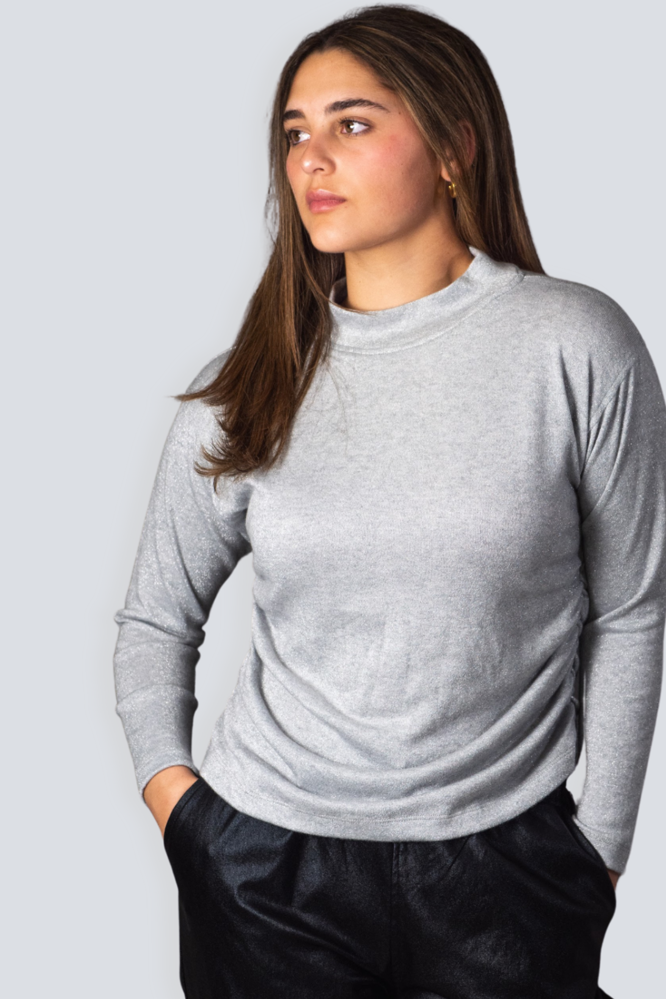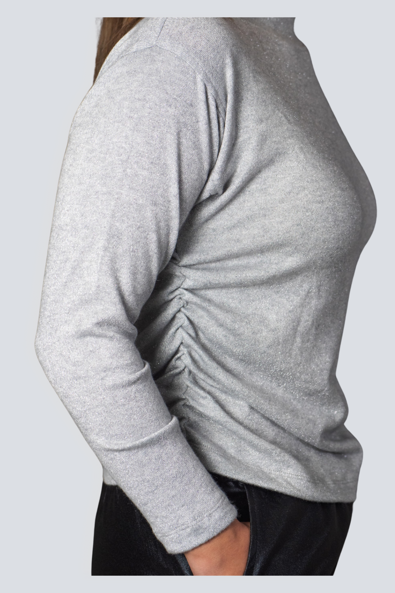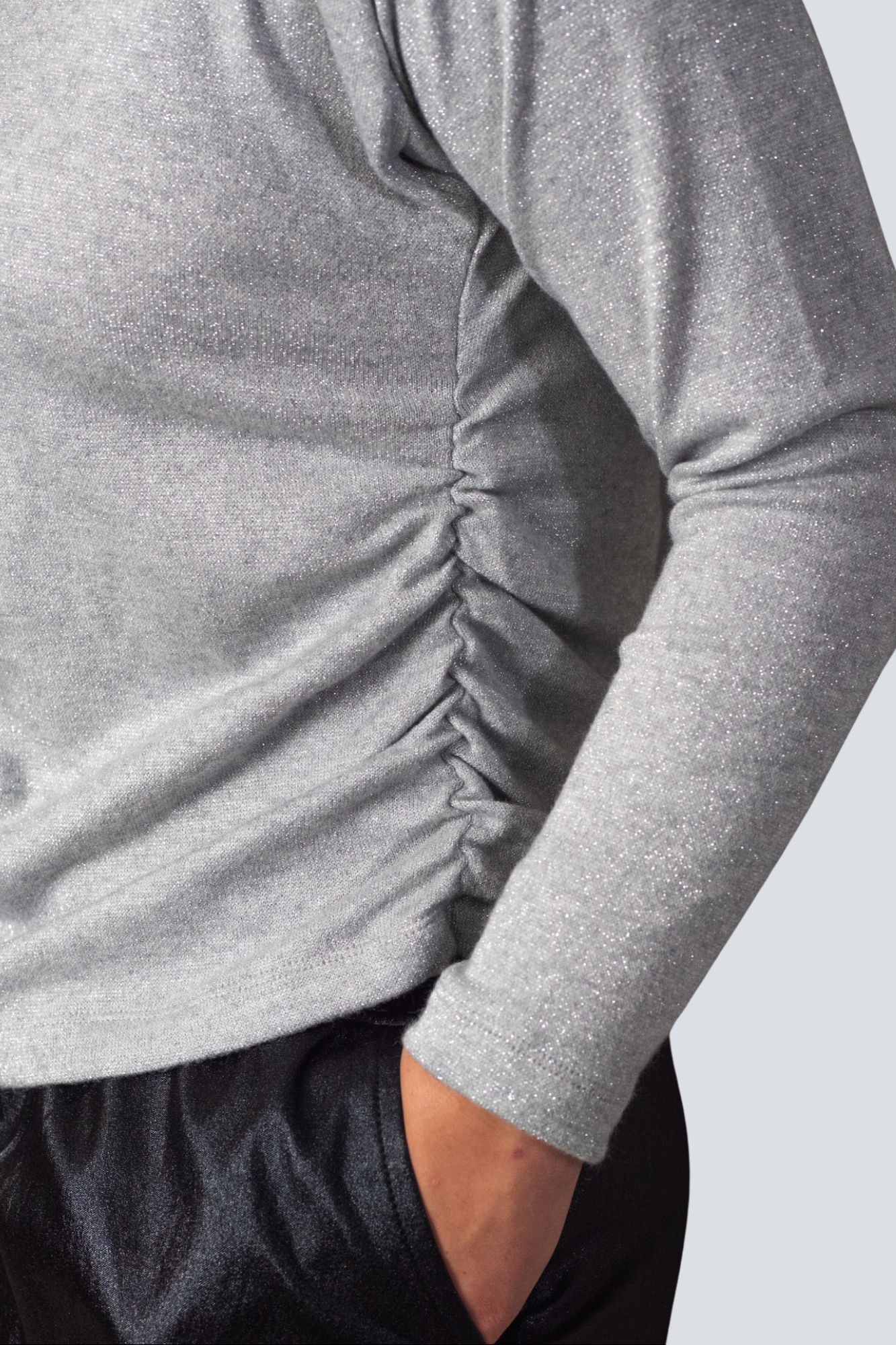 Crafted from luxe knit in a shimmering silver lurex, this elegant piece features ruching detail on the sides for a touch of urban chic. Designed for ease and comfort, it offers a soft and warm embrace with its long sleeves and gently curved hemline.