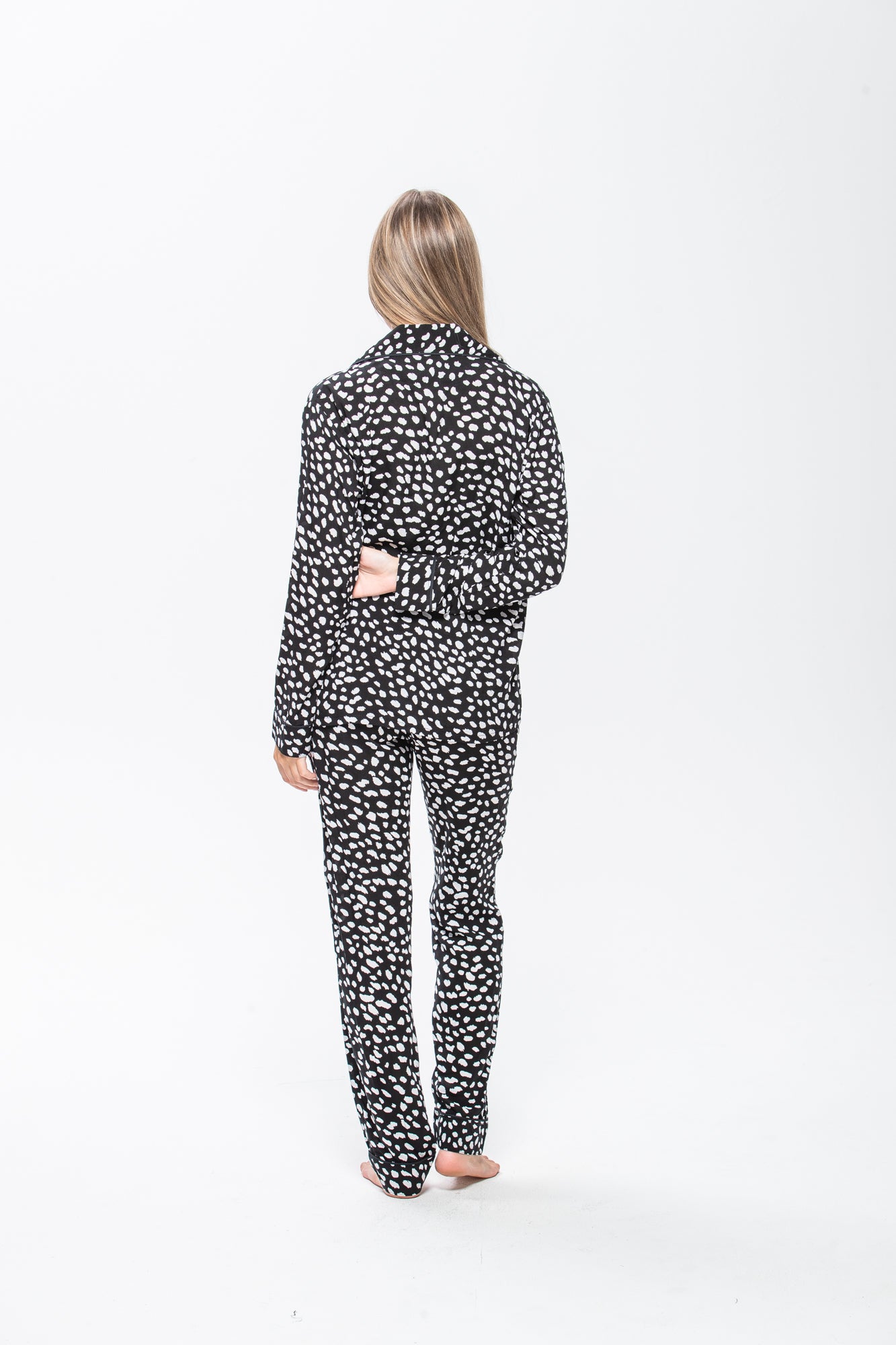 Crafted from 100% rayon in black, the fluid fabric drapes against the skin with undeniable elegance. The thoughtful design features subtle animal print piping that traces the collar, button placket, and cuffs.