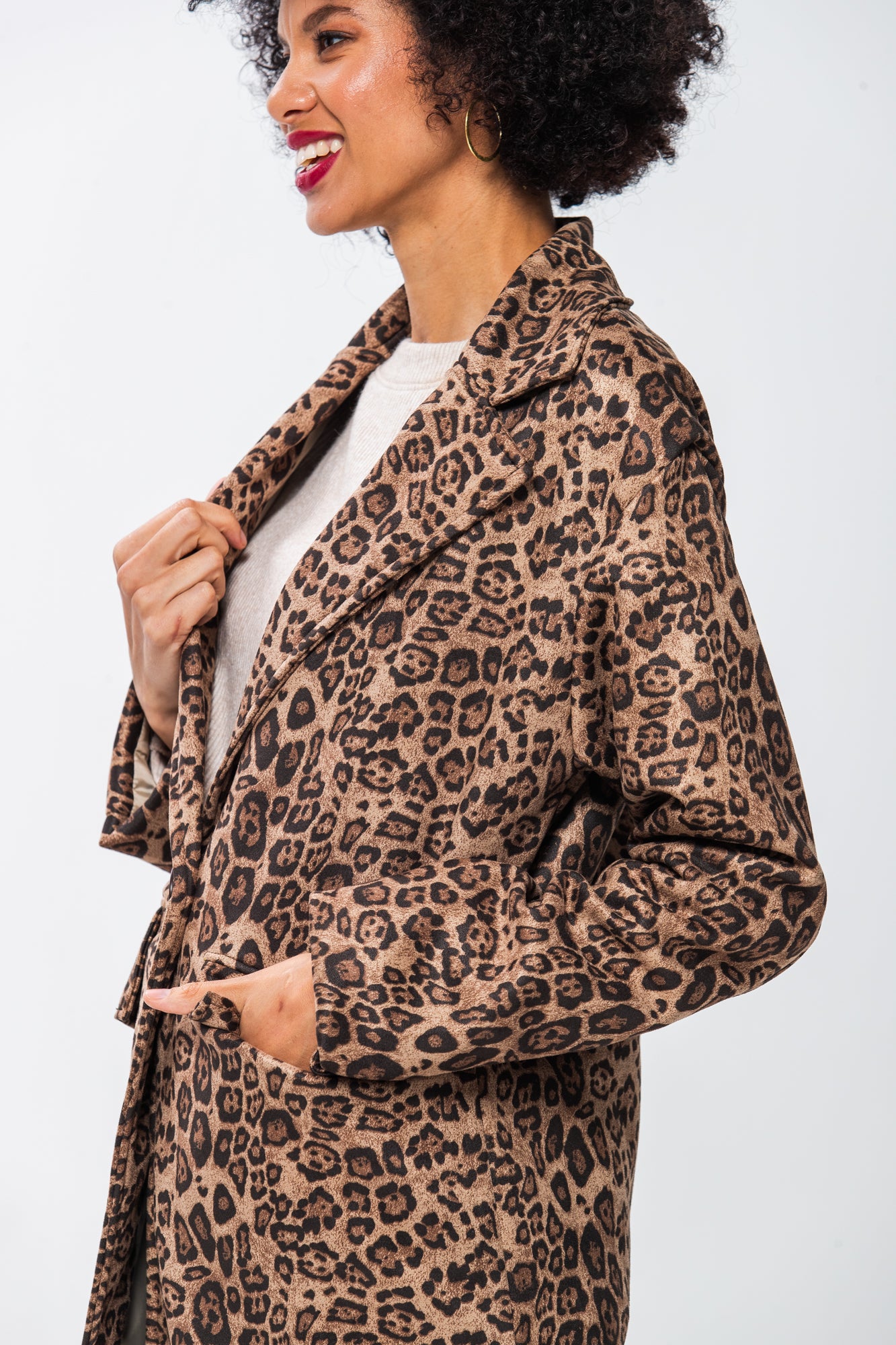 Commanding attention in our signature leopard print, this showstopper transforms the wild pattern into something fiercely sophisticated. Luxurious sueded scuba creates structure with unexpected softness, while the dramatic silhouette with its decisive single button closure creates a silhouette that dominates any room you enter.