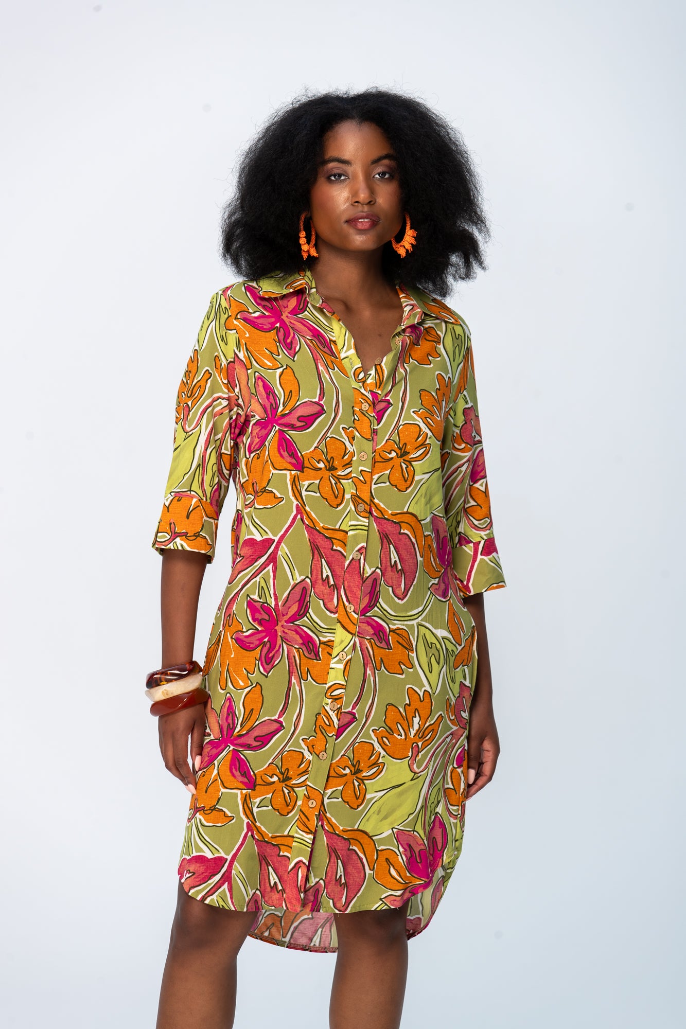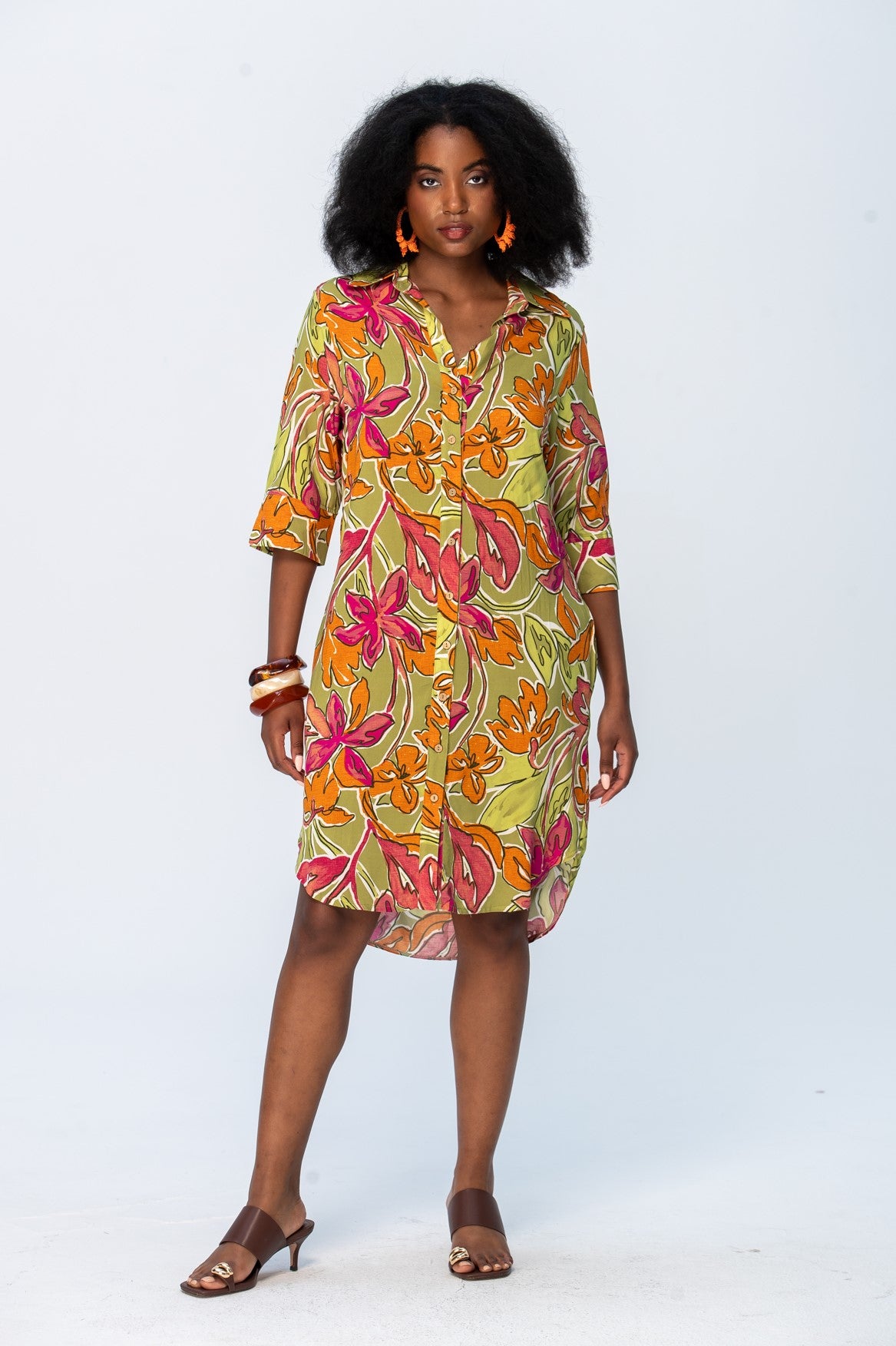 Bold expression meets refined tailoring in our new NINA SHIRT DRESS. This vibrant floral version features rich botanical prints in warm oranges, pinks, and greens. With a classic collar, full button front, and essential pockets, this versatile piece captures the spirit of intentional style.