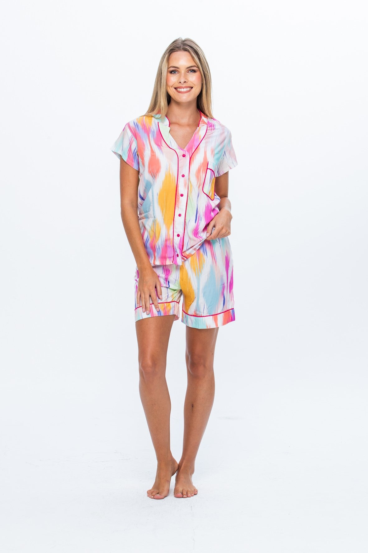 Crafted from the softest rayon with a button-up mandarin style shirt featuring a single front pocket and relaxed short sleeves. The matching elasticated shorts with contrast piping are tailored for a gentle, comfortable fit, ensuring you can unwind without restriction. The breathable fabric keeps you cool through warm summer nights while the classic silhouette brings timeless sophistication to your evening ritual.