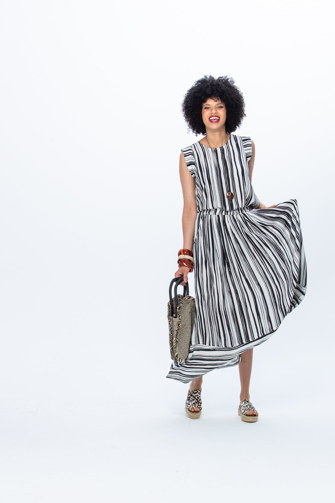 Worn as a co-ord set, the Sorrento Skirt and Aimee Shirt become a full look that reads effortless but intentional. The Aimee keeps things clean on top - relaxed fit, soft cap shoulder, nothing fussy. The Sorrento brings the movement - a gathered midi that swings when you walk.